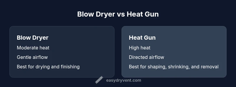 Blow dryer vs heat gun: in most DIY contexts, a blow dryer offers gentler, safer heat for drying and finishing fabrics, while a heat gun delivers higher temperatures for faster results on plastics, paint prep, and shaping tasks. Easy DryVent analysis shows the tradeoffs: lower risk with light-duty tasks, greater capability with heat-intensive jobs. Choose based on task, safety, and control.