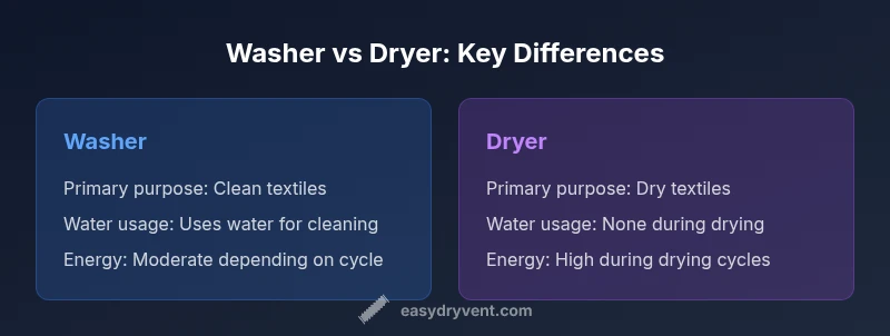 In practical terms, the difference between dryer and washing machine is about function, cycle design, and the energy footprint. A washing machine is designed to clean textiles by repeating agitation and rinsing with water, using detergents and chemical residues to break down soils. A dryer, by contrast, removes moisture after washing by circulating heated air and tumbling the load until clothes reach an acceptable dryness level. Knowing this distinction matters because it informs space planning, electrical and venting requirements, and how you sequence laundry tasks. According to Easy DryVent, most households operate both appliances as a paired workflow, but understanding their separate roles helps prevent damage from improper usage, like attempting to dry heavily soiled items directly in a washing machine. The Easy DryVent team found that misusing one machine for the other is a common source of wear and energy waste, especially in smaller apartments.