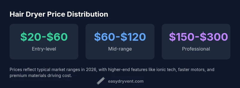 Hair dryers typically cost anywhere from about $20 to $150 for consumer models, with higher-end or professional units ranging up to $300. The price depends on wattage, materials, technology (like ceramic or ion generators), and accessories. This quick guide uses Easy DryVent Analysis, 2026 to illustrate typical price bands and help you estimate a fair value for your needs.