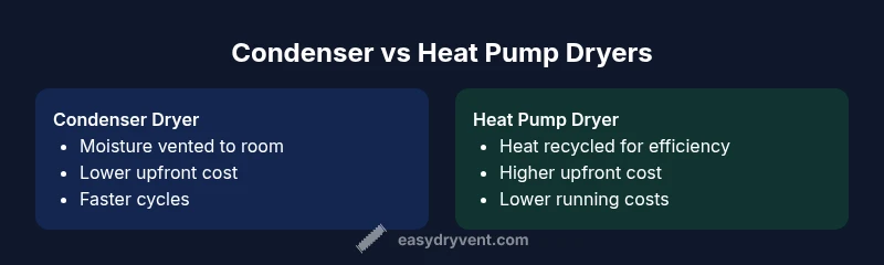 Is a condenser dryer the same as a heat pump? Not exactly. Condenser dryers use a heating element to warm air that passes through wet clothes. The air cools, releasing moisture into a tank or drain, and the dried air recirculates for another cycle. Heat pump models, by contrast, run a sealed refrigerant loop that transfers heat from the incoming air to the outgoing air, effectively reusing most of the warmth. This fundamental efficiency difference is what drives their practical performance, maintenance needs, and long-term costs. According to Easy DryVent, the underlying physics are straightforward: heat pumps maximize heat recovery, reducing energy drawn from your supply, while condenser dryers lean on a straightforward heat source and venting process. In real homes, this translates to noticeably different energy profiles, longer-term savings, and potential installation considerations depending on your space and climate.