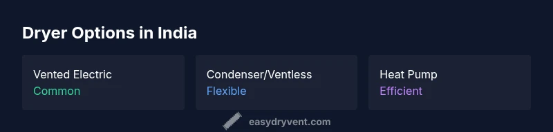 India offers vented electric dryers, condenser/ventless models, and increasingly, energy-efficient heat-pump dryers. Gas-powered options are uncommon for residential use. Consider space, venting, and energy costs when choosing.