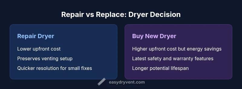 Deciding whether to repair dryer or buy new hinges on cost, reliability, and energy use. According to Easy DryVent, repair is sensible when the fix is inexpensive and the dryer is still reasonably young, while replacement makes sense for older units with repeated failures or rising energy bills. This TL;DR helps homeowners estimate long-term value before diving into detailed checks.