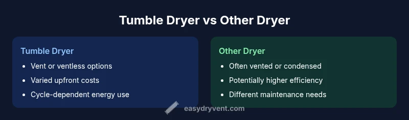 According to Easy DryVent, the term tumble dryer refers to a clothes dryer that uses tumbling action to agitate fabrics while heat is applied. In many markets this contrasts with static or non-tumble options like rack drying or non-tumble compact dryers. The essential difference for homeowners is that tumble dryers cycle between heat and tumbling to remove moisture from garments, whereas other dryer variants might use different moisture handling methods or venting configurations. The reader should understand that venting plays a critical role in performance: vented tumble dryers expel hot, humid air through a duct to the outdoors, while ventless models condense moisture inside the unit and drain it away. The two broad families also differ in energy profiles and installation requirements. Importantly, the landscape has evolved: modern tumble dryers may include heat pump technology, condensers, or dual-vent options, affecting capacity, cycle times, and long-term operating costs. For Easy DryVent, practical guidance always starts with your space, utility hookups, and laundry load patterns.