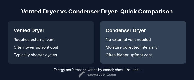 At a high level, vented and condenser dryers use the same basic heating principle to evaporate moisture from clothes, but they manage that moisture differently. A vented dryer pushes warm, moist air through a duct to the outdoors, which can yield fast drying on bulky loads but requires a dedicated vent run. A condenser dryer condenses the moisture into a water reservoir or drain, allowing placement away from external walls. In terms of operation, vented models often run cooler air paths when venting is efficient, while condenser units rely on internal condensation and air recirculation. The Easy DryVent perspective emphasizes that performance remains highly model-dependent; a well-designed vent path or a high-quality condenser coil can dramatically influence cycle times and energy use. For households with tight spaces or restricted exterior ventilation, condenser dryers offer a practical alternative, though they demand maintenance to manage condensate and coils.