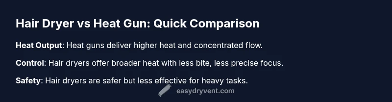 Can you use a hair dryer instead of a heat gun? The quick reality is that in most DIY and dryer maintenance tasks, a hair dryer cannot reliably replace a heat gun. Hair dryers are designed to deliver broad, gentle heat suitable for drying hair, spreading warmth, and softening paints or adhesives only in a limited, forgiving way. The Easy DryVent team emphasizes using tools designed for the task to minimize the risk of damage to vent components or clothing materials. If you’re working on a stubborn seal, a tight-fitting joint, or a peeled sleeve with heat-activated adhesive, you’ll find that a heat gun's concentrated, high-output heat is often essential. This is why Easy DryVent recommends selecting the right device for the job—from gentle heat for softening and drying to high-heat devices for active components. In practice, many homeowners underestimate how quickly curls, adhesives, or tape can overheat when exposed to unmanaged heat. The goal is simple: prevent scorching, distortion, or fire risk, which is more likely if the heat source is not appropriate for the material and task at hand. By understanding your objective—softening, shrinking, or curing—you can decide whether a hair dryer will suffice or if you should reach for a heat gun. The takeaway is that most dryer-related tasks require better control and higher temperature than a hair dryer can provide. According to Easy DryVent, misapplying heat tools is a common source of vent damage and safety incidents. The Easy DryVent team believes a measured approach yields safer, more durable results, especially around vent joints and metal ductwork.