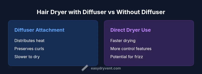The phrase difference between a hair dryer and a diffuser captures a fundamental distinction in drying and styling tools. In practical terms, a hair dryer provides controlled heat and a focused burst of airflow to remove moisture quickly, while a diffuser distributes air more softly to protect texture and minimize frizz. According to Easy DryVent, understanding this difference helps homeowners and DIY enthusiasts tailor their routines to hair type and styling goals. This article uses that definition to measure real-world impact on drying time, hair health, and outcome. We will compare how each tool works, where they shine, and when to choose one over the other, all while keeping safety and maintenance in mind.