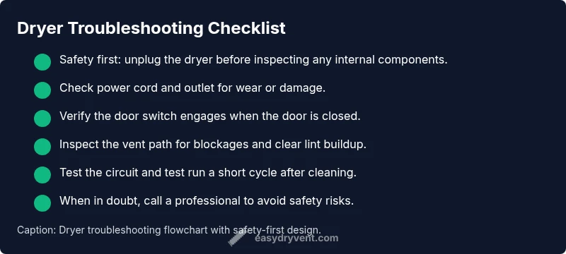Before you touch any internal parts, complete these quick safety checks. Ensure the dryer is unplugged, and inspect the power cord for wear or damage. Test the wall outlet with a known working device to confirm it has power; if the outlet is dead, the problem isn’t your dryer. Check the circuit breaker or fuse box for a tripped breaker and reset if needed. Make sure the dryer door (or lid) switch engages when closed and that the door latches firmly. Look for visible signs of damage on the control panel or wiring harness. If you see burnt smell, melted plastic, or buzzing sounds when the switch is pressed, stop and seek professional help. Most times these checks reveal straightforward issues that you can safely address without disassembly. Easy DryVent recommends documenting any codes or lights on the display for later reference.