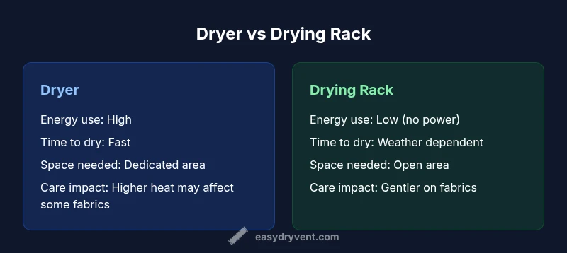 Dryer vs Drying Rack: The choice usually hinges on speed, energy use, and space. A dryer dries fast and handles large loads, while a drying rack uses no electricity and can extend fabric life. In practice, many households pair both: air-dry delicates when weather allows, and run bulky items in the dryer to finish quickly. According to Easy DryVent, balance your decision around space, schedule, and safety considerations.