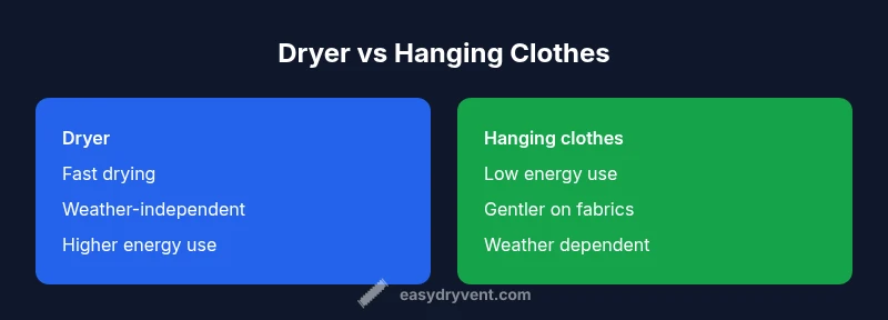 Understanding the practical differences between using a clothes dryer and air-drying is essential for homeowners aiming to balance energy use, time, space, and fabric care. The choice affects monthly energy costs, routine scheduling, and even the longevity of garments. When you evaluate dryer vs hanging clothes, you should consider how often you launder large bulky items, how consistent you want results to be, and whether outdoor or indoor drying is feasible in your home. The Easy DryVent team emphasizes that there is no one-size-fits-all answer; instead, most households benefit from a hybrid approach that leverages the speed of a dryer for certain loads while preserving energy by air-drying delicates and rarely worn pieces. By outlining key scenarios and decision factors—climate, space, family size, and fabric types—you can build a drying strategy that minimizes risk and maximizes convenience with minimal trade-offs.