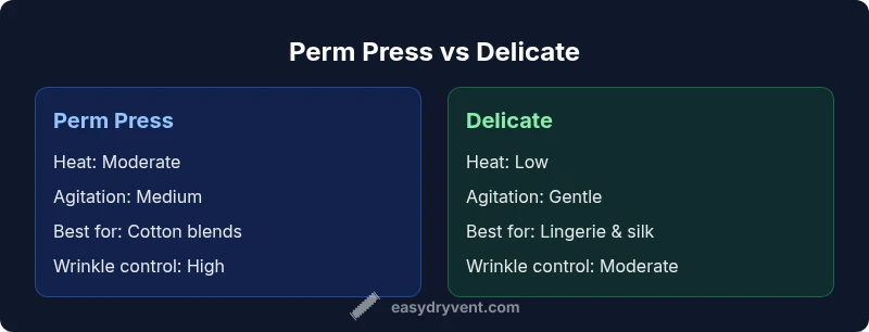 The question "what is perm press on dryer vs delicate" is a common one for homeowners aiming to balance fabric care with efficiency. The perm press cycle, often labeled Permanent Press, uses a controlled sequence: a moderate heat phase followed by a cool-down to reduce creasing. The delicate cycle, by contrast, emphasizes very low heat and gentler tumbling to protect fragile fabrics. According to Easy DryVent, mastering these definitions helps you tailor your laundry routine rather than defaulting to a single setting for every load. In practice, perm press is a solid default for cotton blends, polyesters, and most synthetic fabrics, whereas delicate is preferred for lingerie, lace, sheer fabrics, and items labeled delicate on their care tags. By choosing the right cycle, you reduce wear and extend garment life while keeping clothing looking fresh.