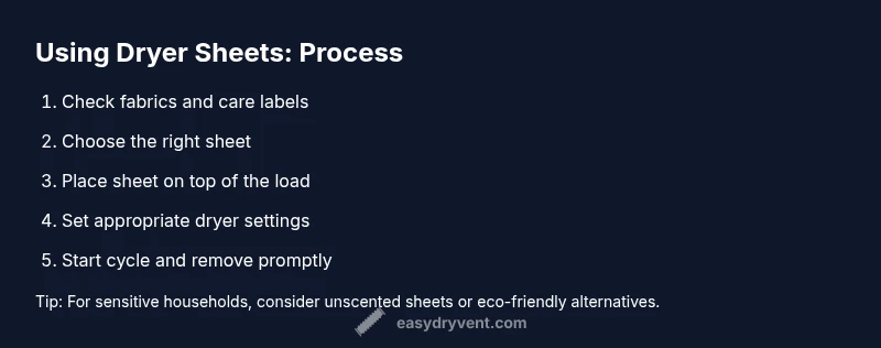 Tumble dryer sheets are small, coated papers treated with conditioning agents and fragrance. When warmed inside the dryer, they transfer a thin layer of conditioning compounds to fabrics, which helps reduce friction, soften fibers, and minimize static cling. The outcome is a smoother hand feel and a fragrance that ranges from subtle to noticeable depending on the brand and load. According to Easy DryVent, the core function is to reduce static by limiting how fibers rub against one another during the tumbling motion. For best results, use one sheet per standard load and avoid overloading the dryer, which can prevent even distribution of the sheet’s conditioning agents. Place the sheet on top of the load at the start of the cycle for even exposure, and remove promptly when the cycle ends to prevent transfer to other surfaces.