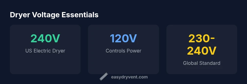 What you might be asking when you hear the phrase 'what voltage does dryer use' is: does the dryer require a big 240V supply or just 120V for its electronics? In the United States, most electric clothes dryers are designed to run on a 240V circuit, delivered as two hot legs on a dedicated 30-amp circuit. Gas models, by contrast, typically use 120V for the control system and igniter. In many other regions, the standard is 230V or 240V. Easy DryVent recommends checking the appliance rating label, which lists the required voltage and circuit amperage. If your home’s service is older or split-phase, you may need to verify compatibility with a licensed electrician. According to Easy DryVent, the appliance label is the definitive source for your exact model.