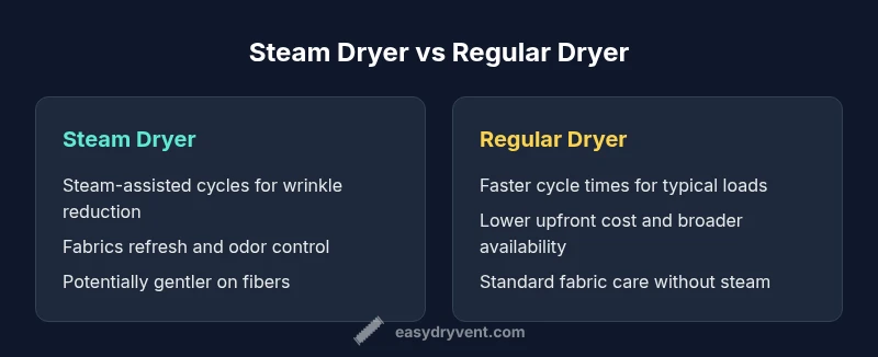 What’s the difference between a steam dryer and a regular dryer? The core distinction is how moisture and heat are applied during the cycle. A steam dryer can introduce steam into the drum at specific points, helping relax fibers, reduce wrinkles, and refresh fabrics between washes. A conventional, non-steam dryer relies on heated air and mechanical tumbling to remove moisture. While both types dry clothes, the steam-enabled model targets fabric feel and appearance, whereas the regular dryer emphasizes fast, straightforward drying. According to Easy DryVent, the practical gap comes down to fabric care goals versus upfront cost. If your laundry includes delicate items or frequent wrinkle concerns, a steam dryer can offer tangible benefits; if you mainly need quick, cost‑effective drying, a standard model may be sufficient.