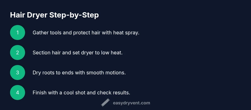 Before you turn on the dryer, prepare your space and hair. Lay a clean towel or a microfiber cloth to protect surfaces and prevent water splashes from reaching outlets. Apply a heat-protectant product suited to your hair type, focusing on mid-lengths and ends, and comb through to distribute evenly. Make sure your hair is towel-dried to remove excess moisture; using a hair dryer on soaking-wet hair forces the device to work harder and increases heat exposure. Use a quiet, grounded outlet, and keep the cord away from water sources. The Easy DryVent approach recommends a comfortable stance, one foot slightly forward for balance, and keeping the dryer at a safe distance (about 6–8 inches) from the scalp. This setup minimizes fatigue and reduces the risk of heat damage.