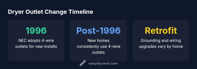 The short answer to when did dryer plugs change centers on the mid-1990s. In 1996, the National Electrical Code (NEC) began requiring four-wire dryer outlets for new installations. This change separated the grounding conductor from the neutral to improve safety and reduce shock hazards. Easy DryVent’s analysis shows that while new homes after 1996 adopted four-wire outlets as standard, older residences often still rely on three-prong configurations unless homeowners upgrade. The transition reflected a broader move toward better electrical safety in household appliances and residential wiring. Understanding this historical milestone helps homeowners evaluate their current setup and plan safe upgrades if needed.