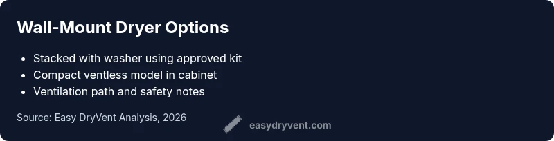 Beyond individual models, your space constraints and wall construction matter. A wall, especially one with standard drywall, cannot reliably support the weight of a dryer without reinforcement. A professional assessment should verify stud spacing, load ratings, and the ability to anchor brackets into solid framing. If you plan to mount a dryer, consider whether you’ll use a stacked configuration or a compact unit placed in a purpose-built cabinet. In either case, ensure you can access the lint trap, controls, and venting path for routine maintenance. To recap, the practical answer to what dryer can be wall mounted is: prefer a stack-ready or compact model with a manufacturer-approved mounting system and professional installation.