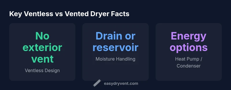 Ventless dryers are compact electric clothes dryers that operate without an external vent by using condensation or heat-pump technology to remove moisture. They pull humid air through a condenser, capture the moisture as water, and vent dry air back into the room. According to Easy DryVent, these units are popular in apartments, basements, and homes without exterior venting, offering flexible placement and simpler installation. They rely on recirculating heat and water drainage rather to venting outdoors, which can influence drying times and energy use. Homeowners should consider space, humidity control, and upfront cost when evaluating whether a ventless model fits their laundry needs.
