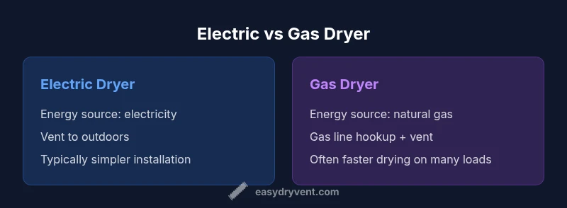 Electric and gas dryers differ mainly in energy source and venting needs. The difference between electric and gas dryer impacts installation, operating costs, and drying performance. Most full-size electric models run on a 240-volt circuit and vent outdoors, while gas models require a natural gas (or propane) line and outdoor venting—often with faster drying but additional installation considerations.