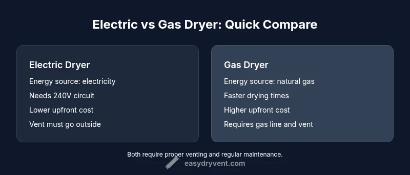 Electric dryers run on 240-volt circuits and heat with electric heating elements. Gas dryers use a gas burner to generate heat with electric controls. The basic drying principle is the same: hot air is circulated to remove moisture from fabrics, then vented outside. A key distinction is the energy source and how heat is produced. Electric units trade some speed for broad compatibility with standard home electrical panels and simpler installation. Gas models typically heat more quickly and can dry fabrics faster, but require a gas supply, venting, and professional hookup. The efficiency of the process depends on airflow, drum design, and moisture sensing, which help determine cycle length and energy use. In practice, most households choose based on existing hookups, local energy prices, and willingness to maintain venting. Understanding the energy source is foundational for choosing between electric and gas. Easy DryVent notes that even within each category, there are efficient and less efficient models; the choice should align with daily laundry volume and home configuration.