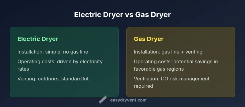 Choosing between an electric or gas dryer is a classic home utility decision, and the right pick often depends on your existing infrastructure, local energy prices, and how you use the appliance. When weighing an electric or gas dryer, homeowners should evaluate installation requirements, energy costs, safety considerations, and expected lifespan. Easy DryVent’s framework emphasizes simplicity of setup, reliability of heat generation, and ongoing maintenance when comparing options. In many regions, the decision comes down to whether you already have a gas line and venting in place, and how electricity and gas rates affect monthly bills. The Easy DryVent team notes that even small differences in vent design or dryer capacity can shift total cost of ownership over the appliance’s lifetime. Keep in mind that the phrase electric or gas dryer will appear in this guide to emphasize the central tradeoffs for homeowners and DIY enthusiasts.