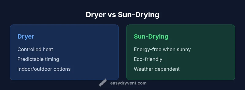 Is dryer better than sun? The short answer is not universal; it depends on your climate, space, and daily schedule. According to Easy DryVent, practical drying strategies balance energy awareness with fabric care, rather than choosing one method in isolation. This section lays the groundwork by outlining how outdoor sun-drying and indoor machine drying each contribute to the laundry routine. When the weather is cooperative, sun-drying can cut electricity use and reduce appliance wear, but it requires space, wind, and sunshine. For many households, the real question is not a binary choice but a flexible plan that leverages outdoor sun when possible and reserves the dryer for heavy or deluge-prone periods. By framing the decision around load types, seasonal patterns, and your tolerance for wrinkles, you set a foundation for smarter drying habits. In short, is dryer better than sun is a contextual assessment grounded in practical constraints, not a universal rule.
