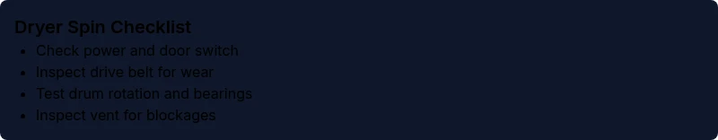 Common spin causes are worn belts, bad door switches, or a seized drum. Electrical faults are less common but possible.
