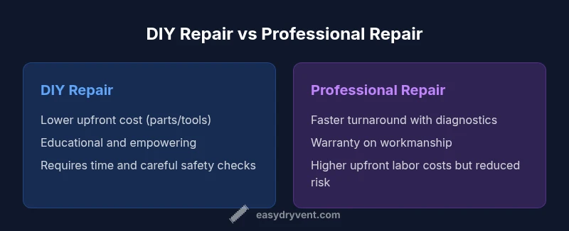 DIY repairs generally cost less in parts and tools and can be completed on your schedule, but time investment and trial-and-error may extend the process. Professional repair includes labor costs but offers faster turnaround, diagnostic accuracy, and often a warranty on workmanship. When weighing costs, consider the value of your time, the potential risk of misdiagnosis, and any warranty implications. Easy DryVent emphasizes that savings vary with the issue and your skill level, so plan for both effort and outcome.