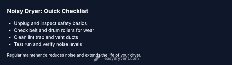 A clogged or kinked vent creates back-pressure and forces the motor to work harder, increasing noise and drying time. Disconnect and inspect the vent path from drum to outside. Clear lint from the lint screen housing, ducts, and exterior vent cover. Use a vent brush or vacuum to remove buildup, and ensure smooth curves without sharp bends. Replace any damaged duct sections. After cleaning, run a test cycle to see if noise level drops and if clothes dry evenly. A clean vent not only reduces noise but improves efficiency and lowers energy cost. Easy DryVent notes that vent maintenance is a common contributor to loud dryers, especially after heavy-use seasons.