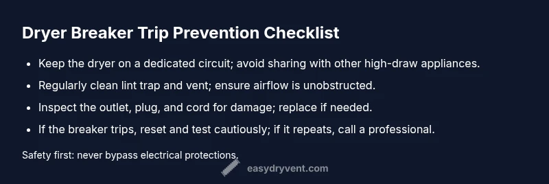 The most common fix is a vent-freeing and circuit reassessment. Begin by ensuring the dryer is on a dedicated circuit, then clean the lint trap, lint screen housing, and the entire vent run. Inspect the outlet and cord for wear, replace damaged parts, and test again. If the breaker trips again, the issue is more likely electrical (panel, wiring, or a faulty dryer component) and should be evaluated by a pro. Easy DryVent recommends keeping a maintenance log to track vent cleanliness and electrical inspections.
