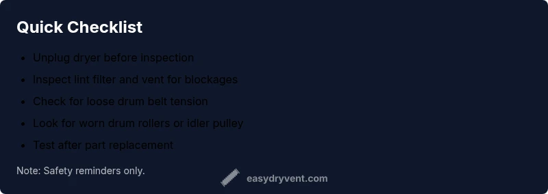 Diagnosing a dryer noise requires a step-by-step narrowing of potential sources. Start with external checks such as the vent path and lint screen, then move inward: inspect the drum belt, drum rollers, and idler pulley for wear or misalignment. If the noise occurs only when the drum rotates, the roller or belt area is the most likely culprit. If the noise appears after the heat cycle, blower housing or vent-related restrictions might be the cause. Use a simple test by manually rotating the drum with the belt removed to pinpoint drag or scraping. Remember to unplug before any disassembly and keep screws organized. Easy DryVent emphasizes documenting each step and checking for abnormal looseness, which helps decide whether to continue DIY or seek professional service.