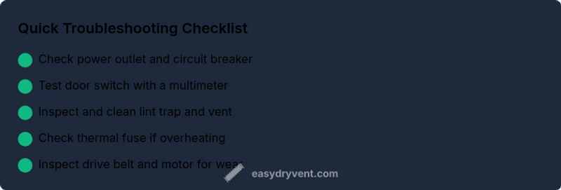 A logical flow helps you separate quick fixes from deeper issues. First, confirm power and the door switch. If power is present, test the door switch for proper operation. If the door switch tests good, inspect the vent path for blockages and clean the lint trap thoroughly. If airflow is restricted, the dryer may shut down to prevent overheating. If airflow is clear, test the thermal fuse and high-limit thermostat, as a failed fuse will stop heat production. For persistent non-starts, examine the drive belt and motor condition. Each step reduces the pool of possible causes and guides you toward the appropriate fix or the professional you may need to call.