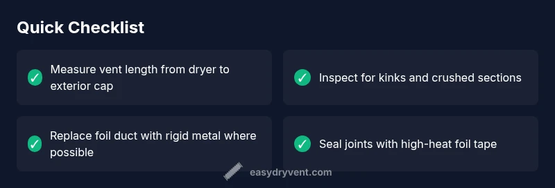 A dryer vent that is too long often creates backpressure, leading to longer dry times and more lint buildup. Start with the easiest checks: verify the path is straight, remove kinks, and confirm there are no blockages within reach. If issues persist, shorten the vent length within code guidelines and retest the dryer.