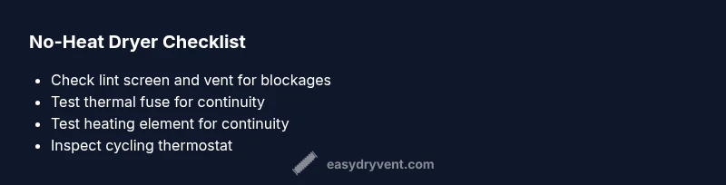 When your clothes tumble but never heat, it's a sign the heating circuit isn't completing. If the symptom is described as 'the dryer works but no heat', treat it as a priority. According to Easy DryVent, dryers with this symptom are usually caused by a disruption in the heating path or a safety interlock that has tripped. In many homes, airflow restrictions from a clogged lint trap or blocked vent make the dryer run but fail to generate heat, triggering protective components to cut power. Start by confirming the dryer has power and the door switch functions, then proceed to checks on the heating element and the thermal fuse. This approach keeps you safe and reduces unnecessary part swaps.