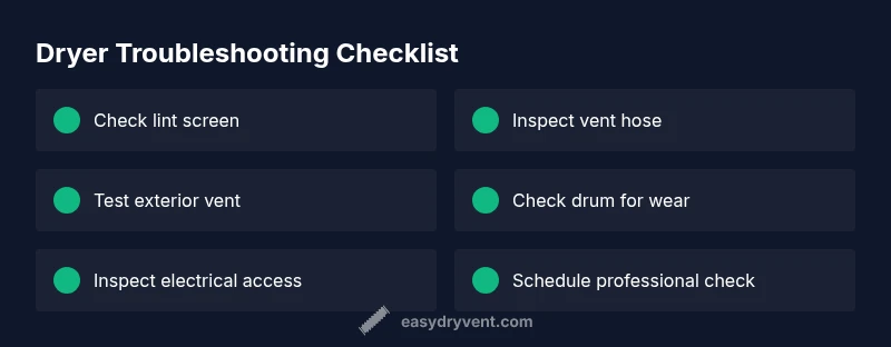 A systematic test helps you verify which cause is most likely without guessing. Start with airflow: after you clean the lint screen and exterior vent, run a short cycle on air only to feel if air moves freely from the exhaust. Next, check heat: set to a hot setting and feel for actual warm air at the vent. Listen for unusual noises and watch the drum to confirm it tumbles smoothly. If heat still won’t reach the clothes, the fault may be in the heating element, thermostat, or thermal fuse. Mark each test result so you can share it with a technician later. Easy DryVent advises documenting test outcomes for clarity when you seek professional help.