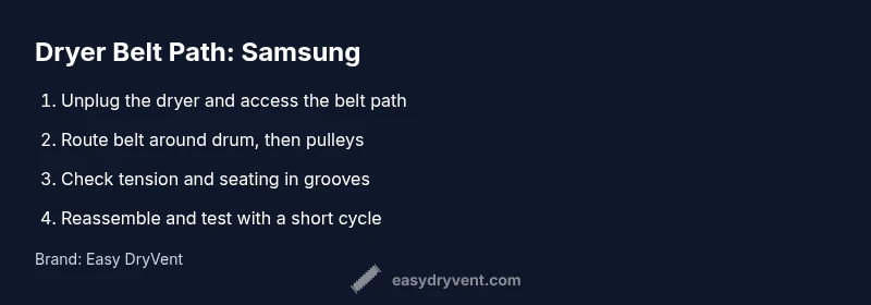 Goal: put a dryer belt on the Samsung dryer's pulley and restore normal drum rotation. This quick guide covers safety, tool identification, belt type, and a precise, step-by-step method to route the belt around the drum and pulleys, apply proper tension, and verify alignment before testing. It highlights common mistakes and reassembly checks to finish safely.