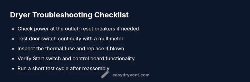 If dryer doesn t turn on, start with a quick 3-step check: confirm the outlet has power, ensure the dryer's door switch is triggering, and verify the start switch is functioning. If these basics fail, proceed with the diagnostic flow below or contact a professional. This gives you a reliable baseline before moving to more advanced checks.
