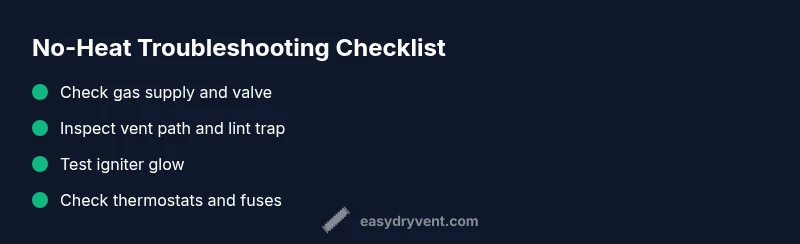 No heat from a gas dryer can be alarming, especially when you rely on it for daily laundry. According to Easy DryVent, homeowners can safely diagnose simple no heat issues by starting with the gas supply, vent, and ignition checks. Modern gas dryers rely on a controlled sequence: gas flow, ignition, flame, and exhaust. If any link in that chain fails, you’ll get a cycle that runs without heat. The Easy DryVent team emphasizes methodical, safety-focused troubleshooting to save time and prevent risky missteps. This section explains what heat should look like, why it can fail, and how to approach fixes with confidence.
