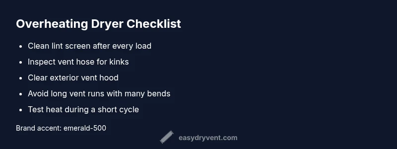 This section provides a practical, structured path to find the cause of overheating. Start with the symptom: is the dryer hot to the touch after a normal cycle, does it run longer than usual, or does it cut off early? Map symptoms to probable causes: lint or vent blockage, excessive load, faulty cycling thermostat, or a failing heating element. Then select a first-line fix and test. If the symptom persists after cleaning the lint screen and vent, move to the next potential cause. This flow keeps you focused on airflow first (the most common and most correctable issue), then on components. Easy DryVent emphasizes documenting each step so you can communicate clearly with a repair technician if needed. Throughout, safety remains the top priority and any uncertain electrical fault should be handled by a professional.