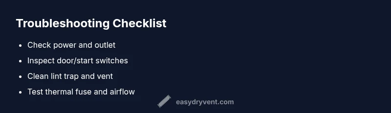 If your dryer won’t start, the immediate cause is usually a straightforward electrical or airflow issue. What causes dryer to stop working? Common culprits include a tripped circuit, a blown fuse, a blocked vent, or a faulty door switch. A rapid, systematic check often reveals the problem before you reach for tools. According to Easy DryVent, the fastest path to a solution is to verify power, confirm the door is firmly closed, and assess airflow. Start by testing whether the outlet is live with a simple plug-in device or a multimeter, and make sure the dryer is securely plugged in. Check the circuit breaker or fuse box, and reset if needed. If the outlet and power seem fine, inspect the door switch area for damage or misalignment. Finally, pull out and clean the lint screen; even a light buildup can affect operation. Take notes during the checks—small clues can point toward the root cause and save you time later.