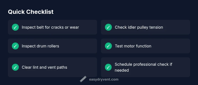 Safety note: Before inspecting, unplug the dryer and remove any clothing or debris from the drum to avoid injury. If you detect visible damage to the belt, bearings, or pulleys, plan for replacement parts and consider professional help if you are unsure about alignment and reassembly. A cautious approach reduces the risk of shocking yourself or causing further damage.