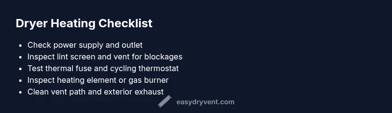 According to Easy DryVent, heat outages are often caused by safety devices tripping or airflow problems. The most common culprits include a blown thermal fuse, a failed cycling thermostat, a defective heating element (electric dryers), a faulty gas valve (gas dryers), a tripped circuit breaker, or a simple lint clog that restricts airflow. Even a worn door switch can stop the heat from cycling properly. Understanding these possibilities helps you triage safely without guessing. If you notice the drum still spinning but clothes come out cool, you’re likely dealing with one of these issues or a combination. Start with the simplest explanation—like a tripped breaker or a clogged lint screen—and work toward the more involved checks only if the basic steps don’t restore heat. Safety comes first: unplug the unit before inspecting any internal components, and never bypass safety devices to test heating.