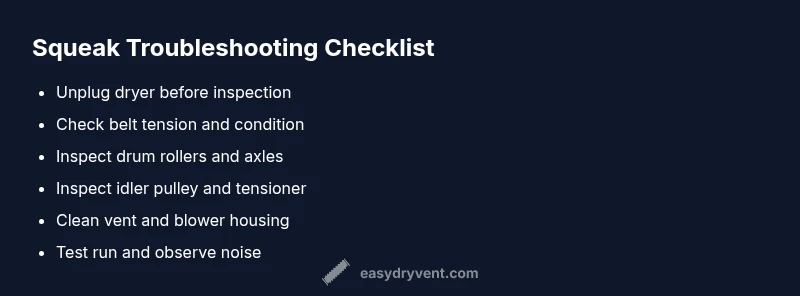 A dryer squeak during operation is usually caused by worn drum rollers, a loose belt, or a vent-related strain. Start by unplugging the unit, then inspect the drum for wobble, verify belt tension, and clear lint from the vent path. If the noise persists, replace faulty parts or contact a professional for safety and accuracy.