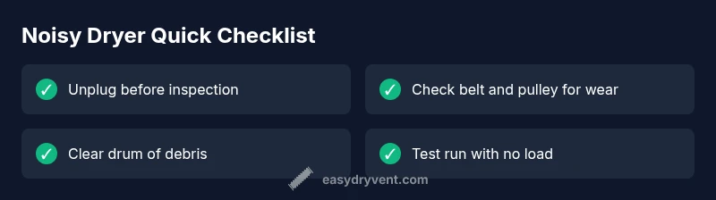 Prevention is the best cure for noisy dryers. Regular lint removal, vent cleaning, and periodic belt inspection reduce wear and noise. After repairs, run a test cycle with no load to confirm quiet operation and verify that the drum spins freely without rubbing. Keep a maintenance log to track belt ages and vent cleanliness. The Easy DryVent team emphasizes routine checks as a safeguard against future noises and longer-term damage. If you hear grinding, persistent high-pitched sounds, or warmth near the vent, stop using the machine and contact a technician promptly to avoid fire risk or electrical hazards.