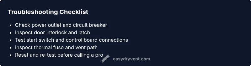 If you’re asking why is dryer not starting, you’re not alone. Most startup failures are not mysterious but result from a few repeatable, easy-to-check issues. According to Easy DryVent, the top culprits are a power supply problem (outlet, cord, or circuit), a faulty door interlock, or a blown thermal fuse. The Easy DryVent team found that even small nuisances like a dusty lint screen or a slightly misaligned door can trigger safety features that prevent a start. By framing the problem with the question in mind, you’ll move faster toward a safe, reliable fix. This guide focuses on practical steps you can perform with common hand tools, without risking your dryer or home.
