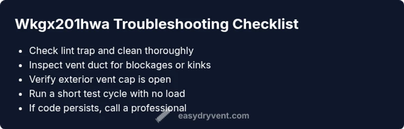 Urgent guide to diagnosing and fixing error code wkgx201hwa on your dryer. Learn immediate steps, common causes, safety tips, and when to call a pro. Easy DryVent offers practical, cost-aware guidance.